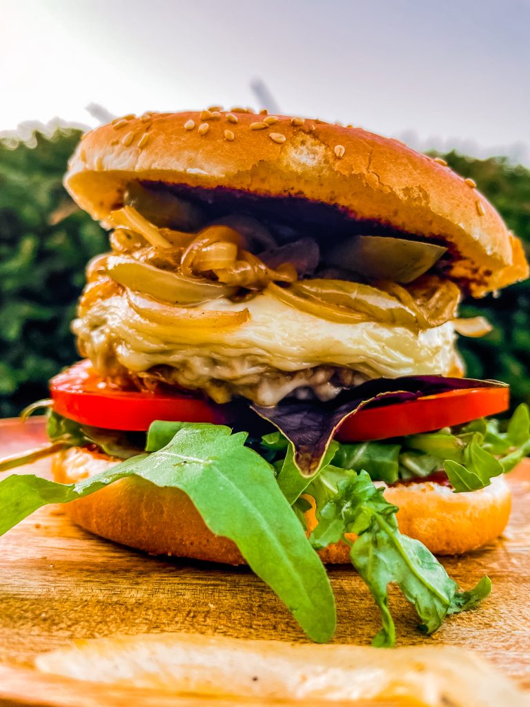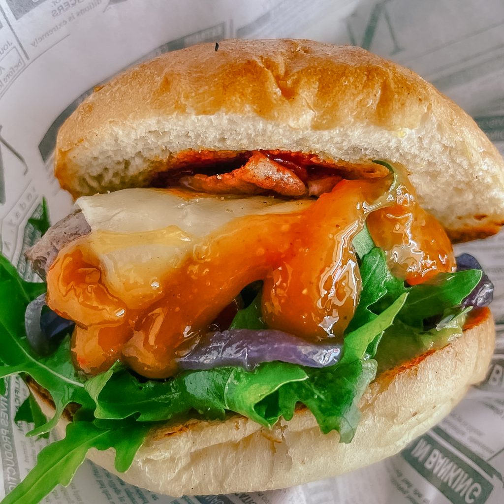 MO BEEF: Beef Patty, Cheddar, Bacon, Schmorzwiebel, Rauke, BBQ Sauce, Mango Relish