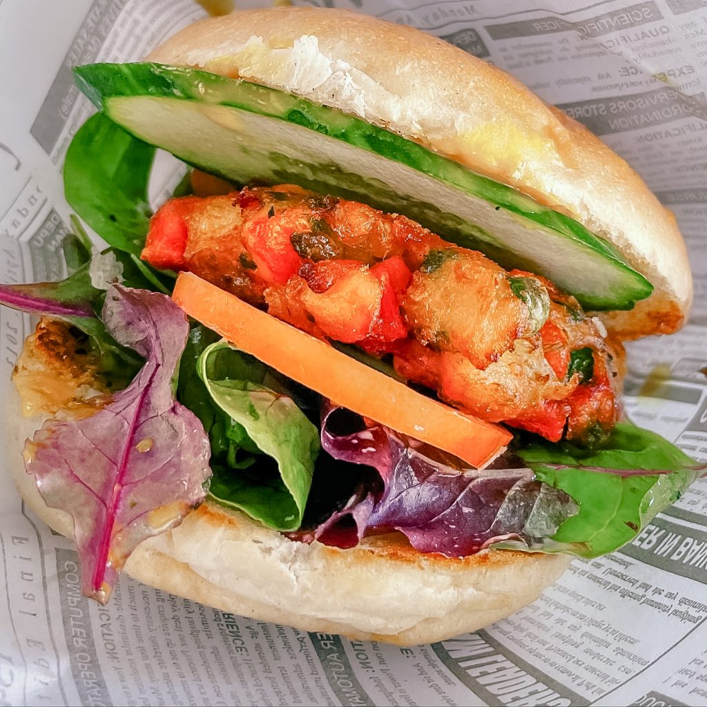 MO VEGGI: Falafel oder Gemüsepatty, Rauke, Tomate, Gurke, Honig-Senf Sauce